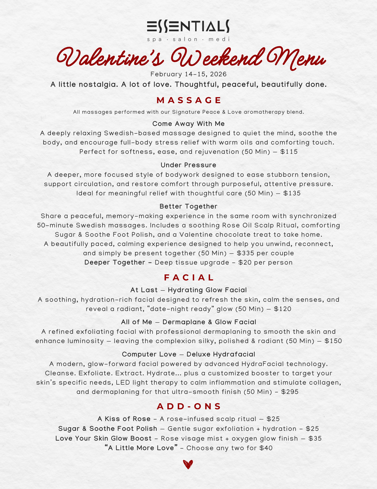 This Valentine’s Weekend, we invite you to slow down and experience love in a gentler way. Thoughtfully curated and intentionally designed, our Valentine’s menu is an intimate collection of experiences created to touch all the senses — through soothing touch, warm aromatherapy, calming rituals, and moments of quiet connection.